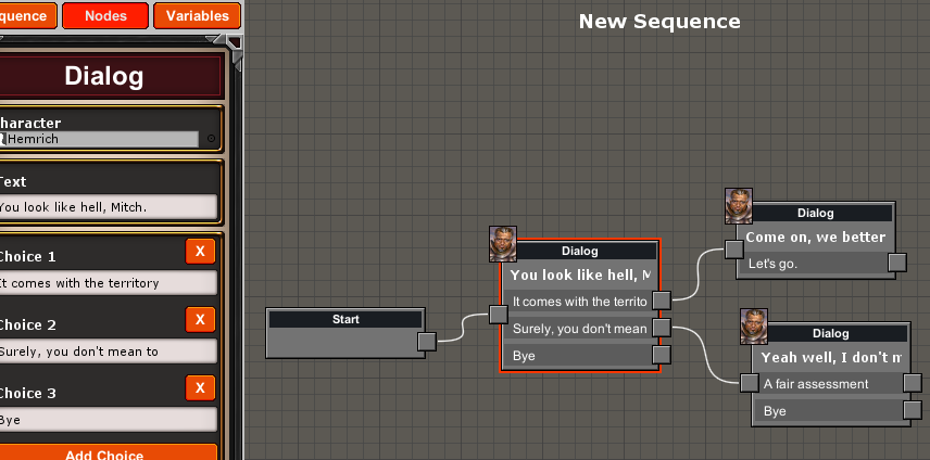 A node based conversation editor coded in C#. The editor is build into the engine editor for quick iteration and data interoperability.